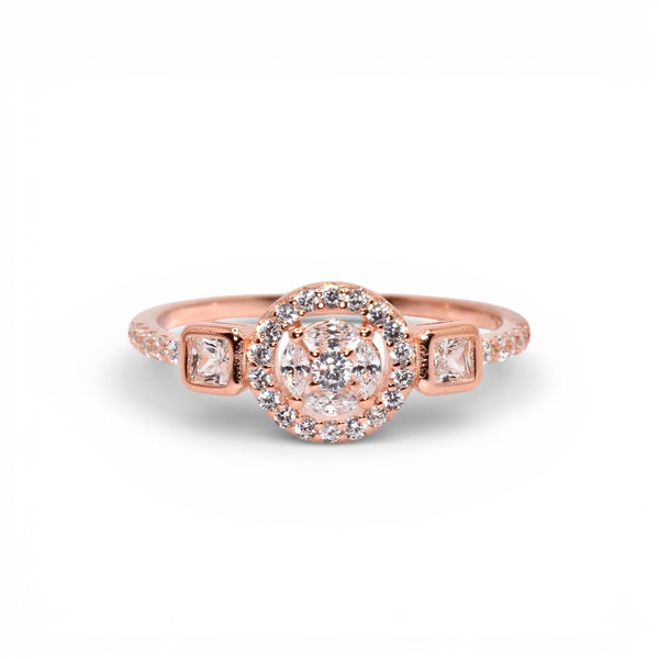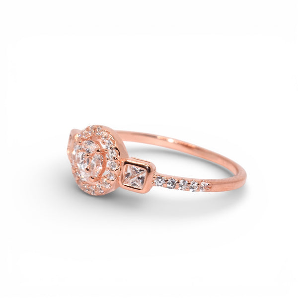 Product Description: Rose Gold Halo Solitaire Three Stone Ring