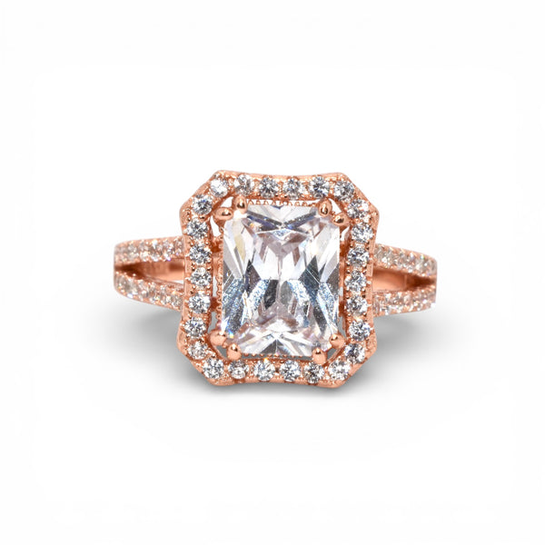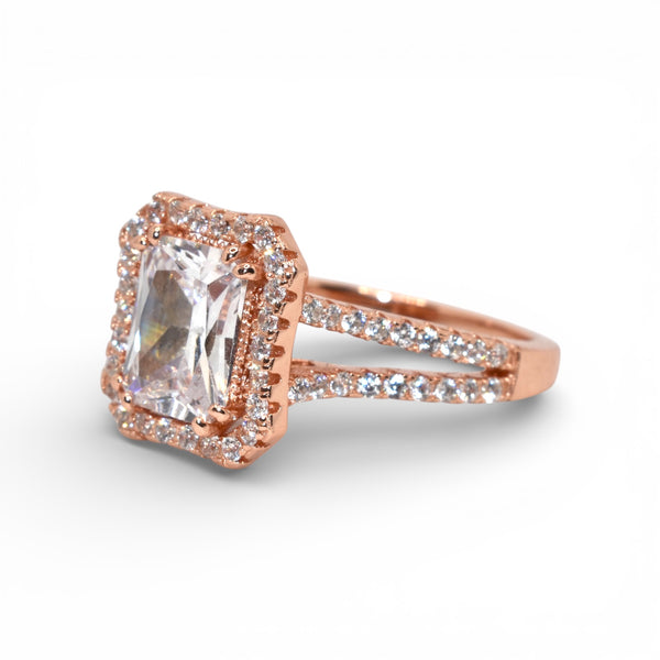 Product Description : Rose Gold Halo Emerald Cut Ring