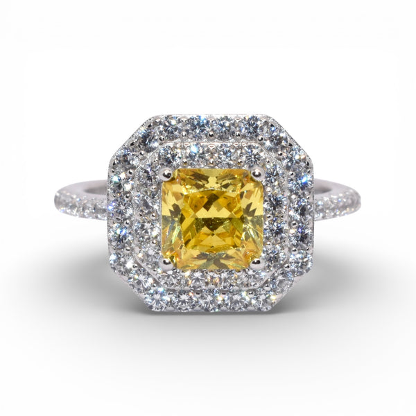 Product Description : Double Halo Yellow Coloured Cushion Cut Ring